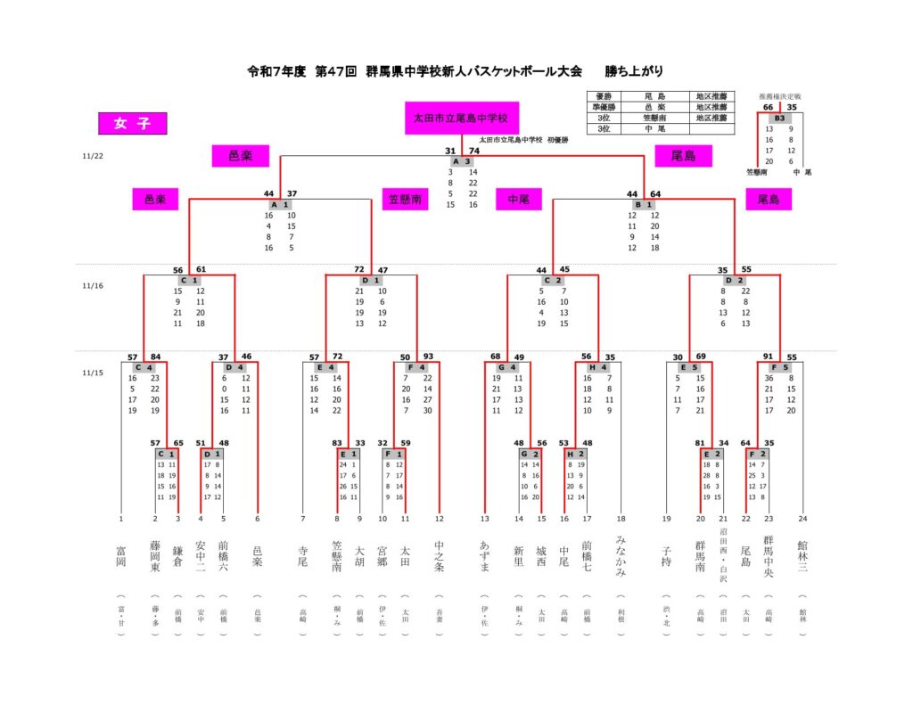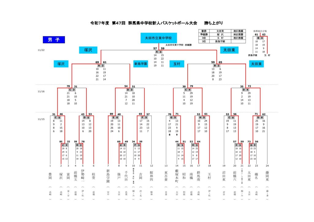 | 令和7年11月15日(土) | 高崎市榛名体育館 ・ 高崎市群馬体育館 ・ 玉村町社会体育館(1回戦・2回戦) |