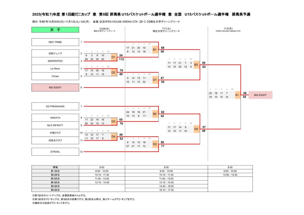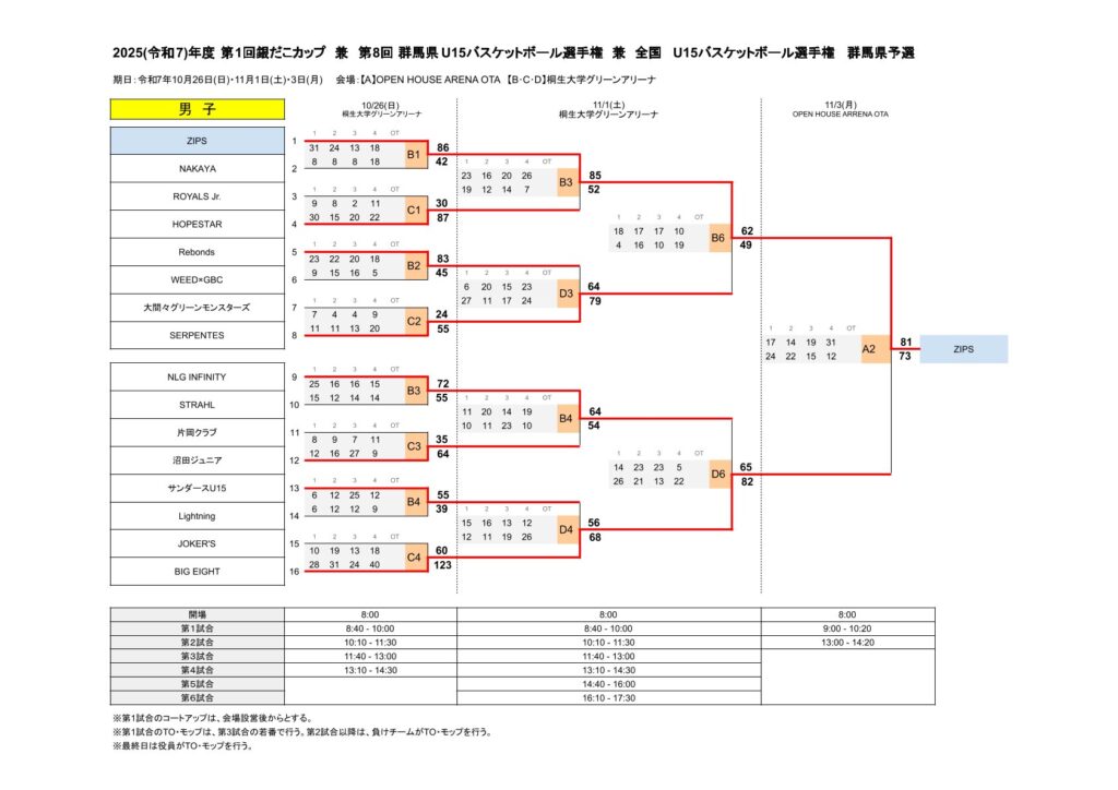 優勝した男子:ZIPS BASKETBALL ACADEMY 女子:BIG EIGHT BASKETBALL CLUBは、2026年1月4日 (日)~8日 (木)京王アリーナ TOKYO ─ (旧名称:武蔵野の森総合スポーツプラザ)にて開催されるJr.ウインターカップ 2025-26(2025年度第6回全国U15バスケットボール選手権大会)に出場します。